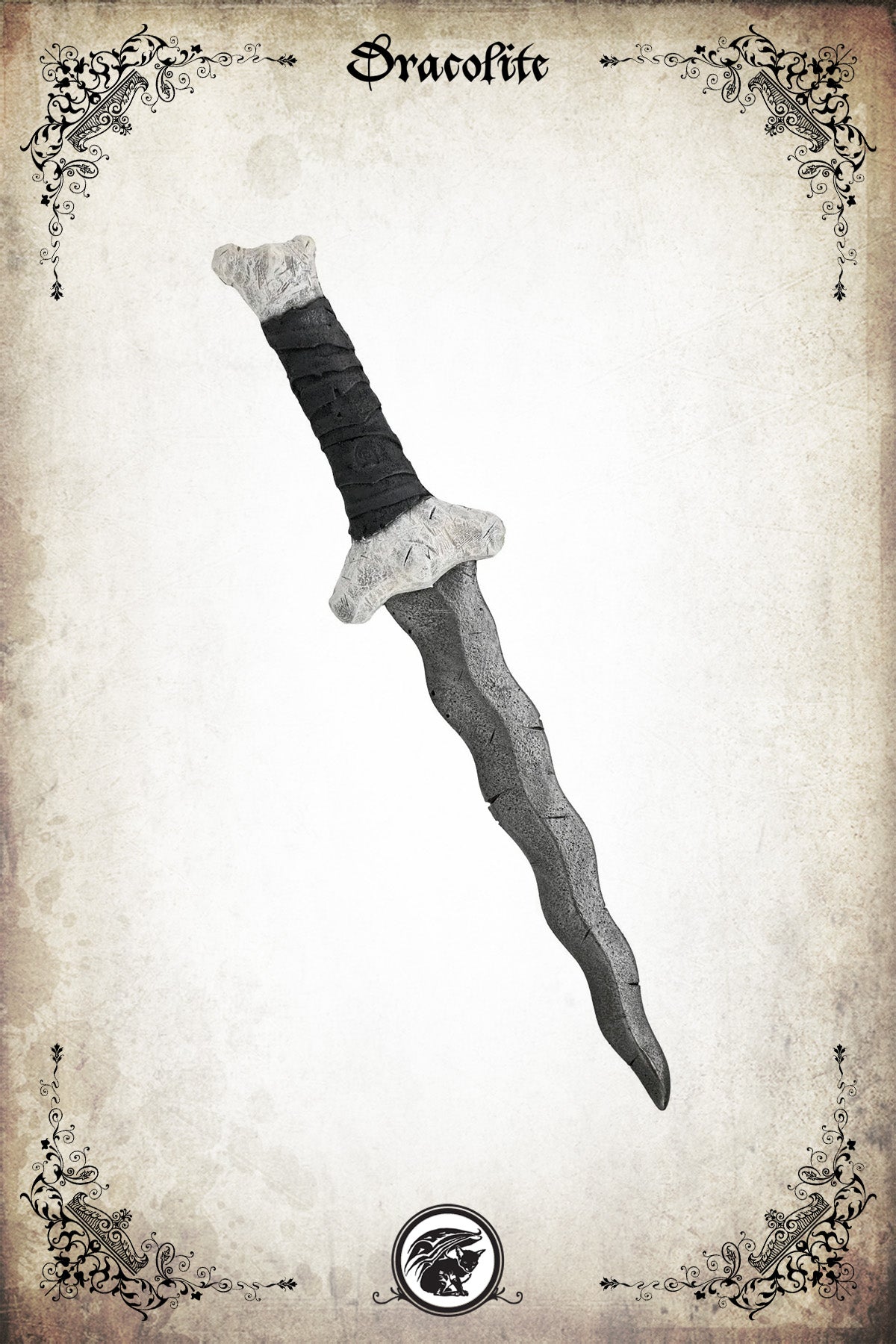 Forgée dans l’esprit des forges les plus sombres, cette dague kriss orque Calimacil se distingue par sa lame ondulée à l’apparence brute, semblant avoir été façonnée par un forgeron sauvage. Sa garde et son pommeau, imitant l’os usé, apportent un contraste saisissant avec la poignée noire enroulée. Cette conception assure une prise en main ferme, idéale pour les combats de jeu de rôle grandeur nature (GN), tout en garantissant une sécurité optimale grâce à l’utilisation de mousse Calimacil et d’un noyau en fibre de verre robustes.